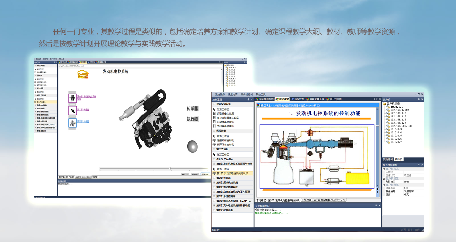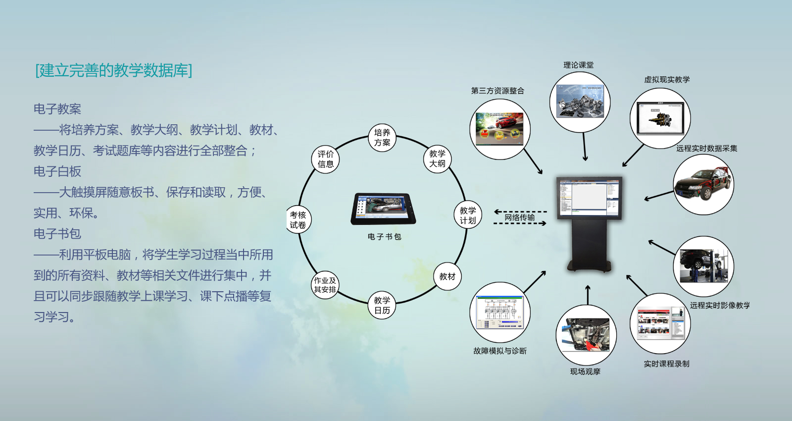 如何實(shí)現(xiàn)教學(xué)過程信息化?我們一直在探討。在過去的市場調(diào)查中,我們發(fā)現(xiàn),能夠用于信息化教學(xué)的手段很多。如網(wǎng)絡(luò)技術(shù)、仿真軟件技術(shù)、影音傳輸技術(shù)、物聯(lián)網(wǎng)技術(shù)、電子書包技術(shù)、二維、三維圖像技術(shù),但現(xiàn)有的這些技術(shù)又都是零散的,不能完全在一個(gè)平臺(tái)調(diào)用的。而我們在教學(xué)過程中需要與學(xué)生的教學(xué)互動(dòng)與管理;需要調(diào)用與講課內(nèi)容相關(guān)的輔助軟件;需要調(diào)用實(shí)訓(xùn)設(shè)備或儀器來驗(yàn)證某原理波形及檢測方法;在實(shí)際拆裝及檢測過程中實(shí)際教給學(xué)生標(biāo)準(zhǔn)的工作流程及設(shè)備使用程序。針對衛(wèi)星學(xué)校的合作需求需要進(jìn)行遠(yuǎn)程師資培訓(xùn),等等。這些,目前我們老師使用的教學(xué)手段是達(dá)不到的。