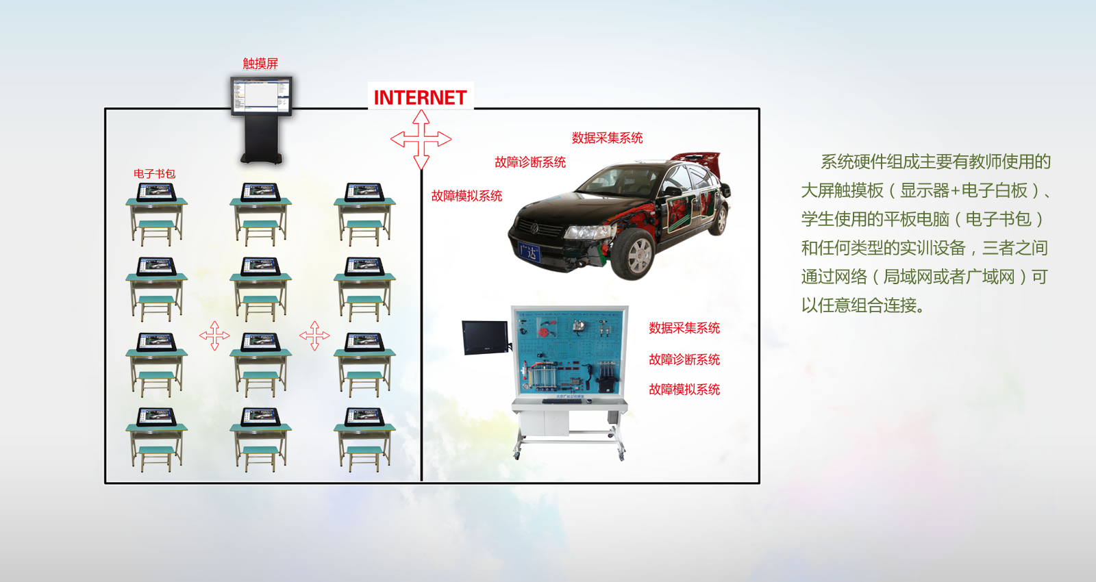 針對信息化教學(xué)的實(shí)際需求,北京廣達(dá)汽車維修設(shè)備有限公司近期研發(fā)推出的“全信息理實(shí)一體教學(xué)G平臺(tái)”,對實(shí)訓(xùn)教學(xué)軟硬件資源全面整合,很好的解決了教學(xué)過程信息化的問題。