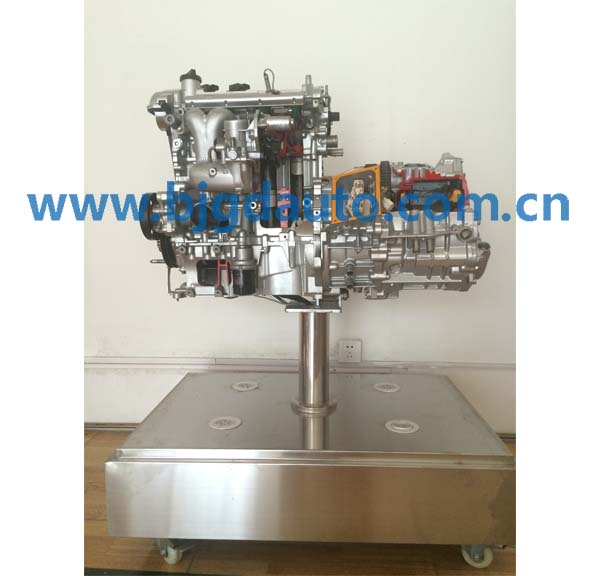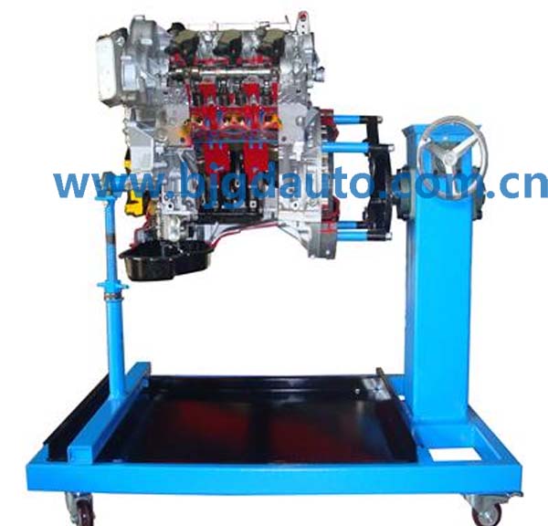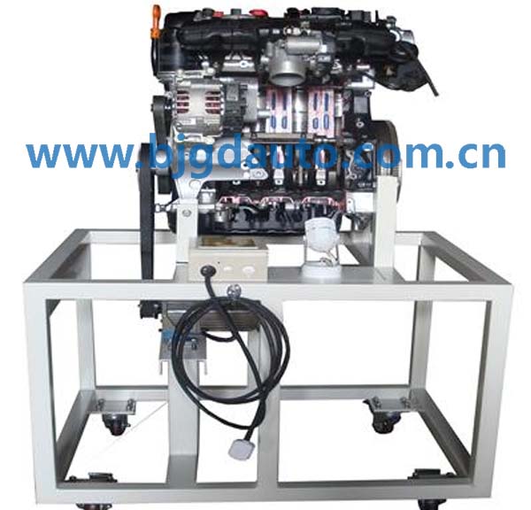 設(shè)備采用電控發(fā)動機總成實物制作,發(fā)動機的關(guān)鍵部位加以爆炸式解剖,解剖剖面采用硬拉絲鍍膜工藝、精細分色,內(nèi)部和外部機件電鍍處理,其他部件鈍化防腐,根據(jù)用戶要求采用各種材質(zhì)、各種形狀的底座。發(fā)動機采用減速電機驅(qū)動。配置射燈直觀、清晰觀察發(fā)動機的組成和機構(gòu)的運動關(guān)系,采用光電程控技術(shù),通過LED燈顯示發(fā)動機各缸工作狀態(tài)。氣缸、活塞、曲軸連桿、凸輪軸、進氣門、排氣門、氣門頂、火花塞、噴油器、進氣歧管、排氣歧管、發(fā)電機、機油泵、水泵、節(jié)溫器、噴油嘴、節(jié)氣門體等內(nèi)部結(jié)構(gòu)清晰可見。利用本實驗臺可以使學(xué)員輕松、真實地了解發(fā)動機機械系統(tǒng)的組成、各部件的外形、各機構(gòu)彼此之間的連接和運動關(guān)系,加深學(xué)生對發(fā)動機機械系統(tǒng)組成和工作原理的理解,幫助學(xué)生理解抽象的控制理論。本實驗臺制作精致,設(shè)計合理,安全可靠,教學(xué)功能完備,是各類培訓(xùn)機構(gòu)講授汽車發(fā)動機結(jié)構(gòu)課程的理想教學(xué)平臺。