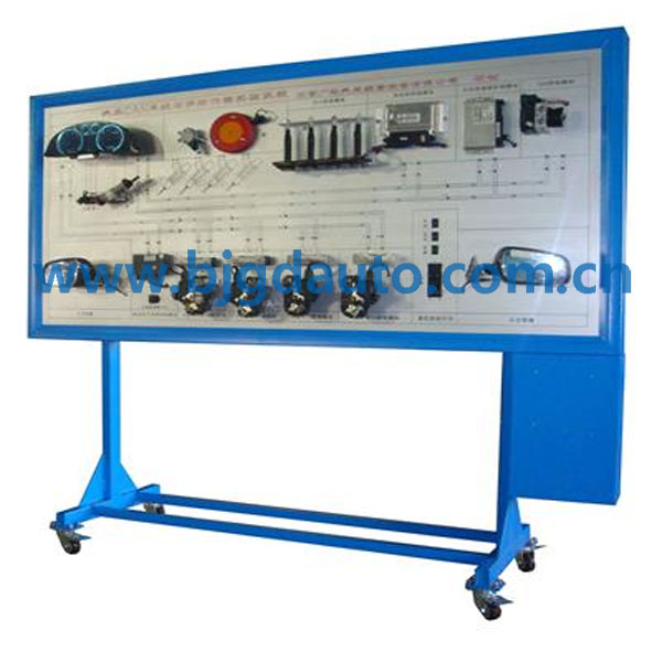 設(shè)備采用汽車網(wǎng)絡(luò)系統(tǒng)的原車器件組成,包括:發(fā)動(dòng)機(jī)控制模塊、自動(dòng)變速器控制模塊、ABS控制模塊、組合儀表、曲軸位置傳感器、凸輪軸位置傳感器、點(diǎn)火線圈、診斷接口、點(diǎn)火開關(guān)、舒適系統(tǒng)控制模塊、左前車門控制模塊、左后車門控制模塊、右前車門控制模塊、右后車門控制模塊、各門門鎖、后視鏡等部件。外加系統(tǒng)主要包括: 故障設(shè)置系統(tǒng)、故障顯示裝置、檢測(cè)端子、位置傳感器觸發(fā)裝置、故障設(shè)置裝置、數(shù)據(jù)顯示裝置以及安全防護(hù)裝置等。