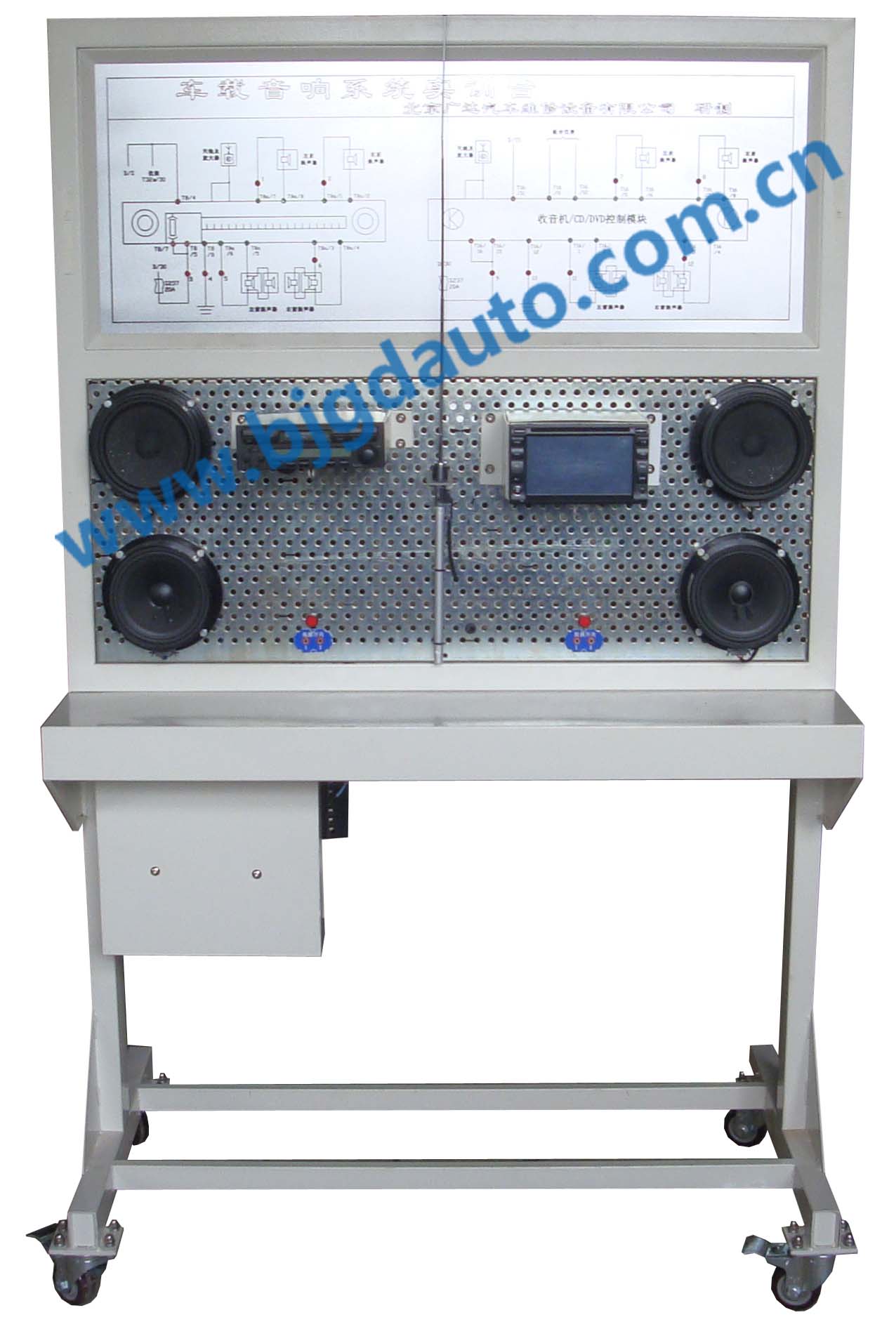 設(shè)備采用原車汽車音響、倒車?yán)走_(dá)、GPS定位系統(tǒng)器件組成,包括:收音機(jī)/CD/DVD控制模塊、揚(yáng)聲器、倒車攝像頭等。外加系統(tǒng)主要包括: 故障設(shè)置系統(tǒng)、故障顯示裝置、檢測(cè)端子以及安全防護(hù)裝置等。本臺(tái)架可以完整展示汽車音響、倒車?yán)走_(dá)、GPS定位系統(tǒng)系統(tǒng)的組成、結(jié)構(gòu)和工作原理,可以進(jìn)行系統(tǒng)常見故障的模擬、診斷和檢測(cè)實(shí)操訓(xùn)練,提高學(xué)生分析和解決實(shí)際問題的能力,適合中高等汽車院校與培訓(xùn)機(jī)構(gòu)對(duì)學(xué)員進(jìn)行教學(xué)的需要。
