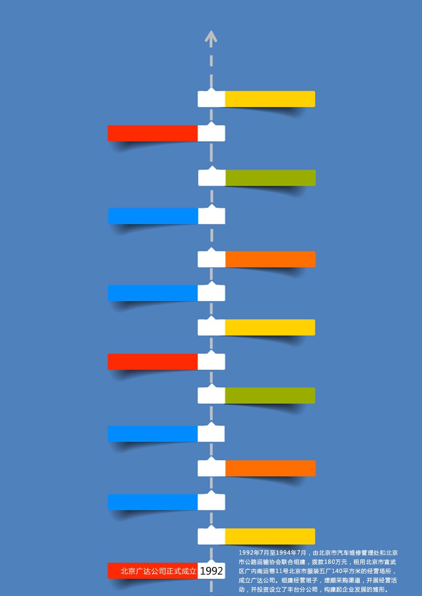1992年7月至1994年7月,由北京市汽車維修管理處和北京市公路運(yùn)輸協(xié)會(huì)聯(lián)合組建,撥款180萬元,租用北京市宣武區(qū)廣內(nèi)南運(yùn)巷11號(hào)北京市服裝五廠140平方米的經(jīng)營場所,成立廣達(dá)公司。組建經(jīng)營班子,理順采購渠道,開展經(jīng)營活動(dòng),并投資設(shè)立了豐臺(tái)分公司,構(gòu)建起企業(yè)發(fā)展的雛形。